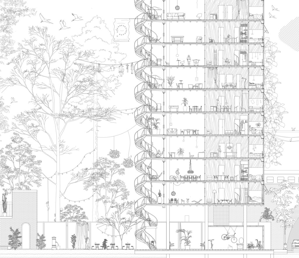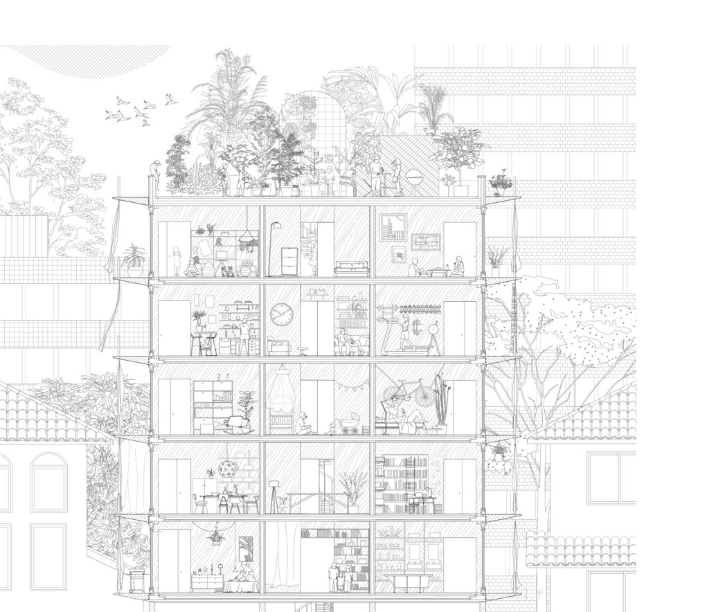 Wachsenden Städten mangelt es an zentrumsnaher Fläche für qualitativen Wohnraum und mittlerweile drückt überall der Schuh. Mit ihren urbanen und progressiven Experimenten, hinterfragen sie konventionelle Ansätze des Wohnens. Im Sinne einer gemeinwohlorientierten Gesellschaft überträgt das Trio Ideen der „Sharing Economy“ auf den Stadtraum: Weniger private Räume, Mehrfachnutzungen oder das Auflösen von Eigentumsgrenzen werden in unterschiedlichen Szenarien verpackt.