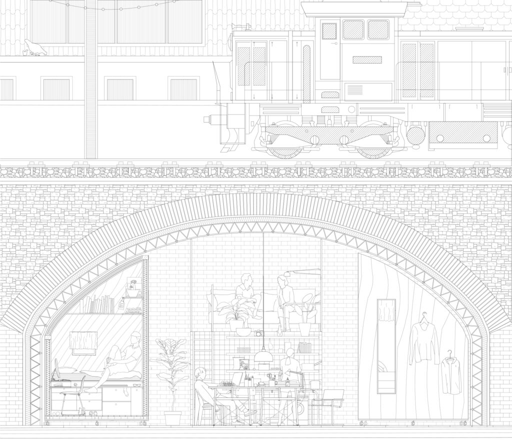 Innerhalb Kölns wurden verschiedene Orte ausgewählt, die als Ausgangspunkt ihrer experimentellen Versuche zum Wohnen dienen. Neben einem Parkplatz oder einer Schrebergartensiedlung, wurde auch einer der leerstehenden Bahnbögen in der Hüttenstraße in Köln-Ehrenfeld, als Projektionsfläche für eine neue Typologie des Wohnens genutzt.